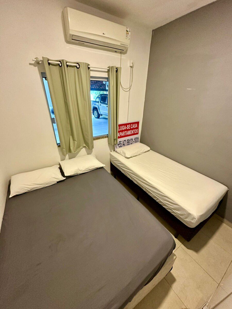- Quarto com cama de casal, cama de solteiro e ar condicionado.