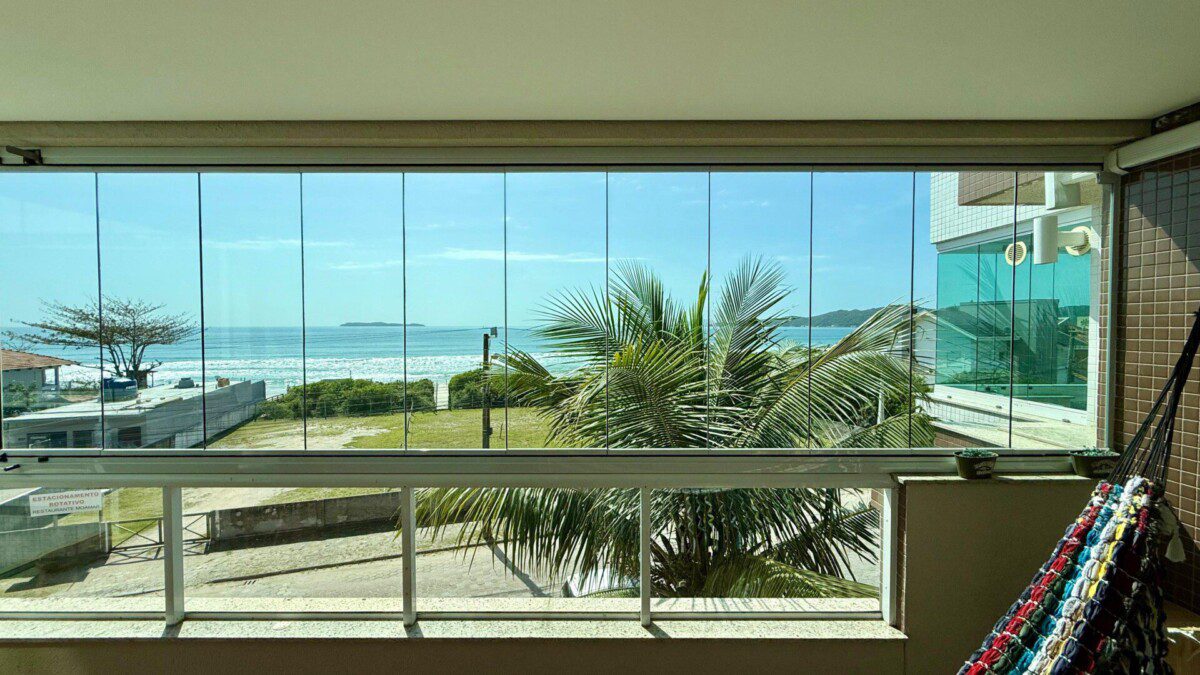 - Sala de estar com sofá retrátil, ar-condicionado, SMART TV e acesso à sacada com churrasqueira e vista para o mar.