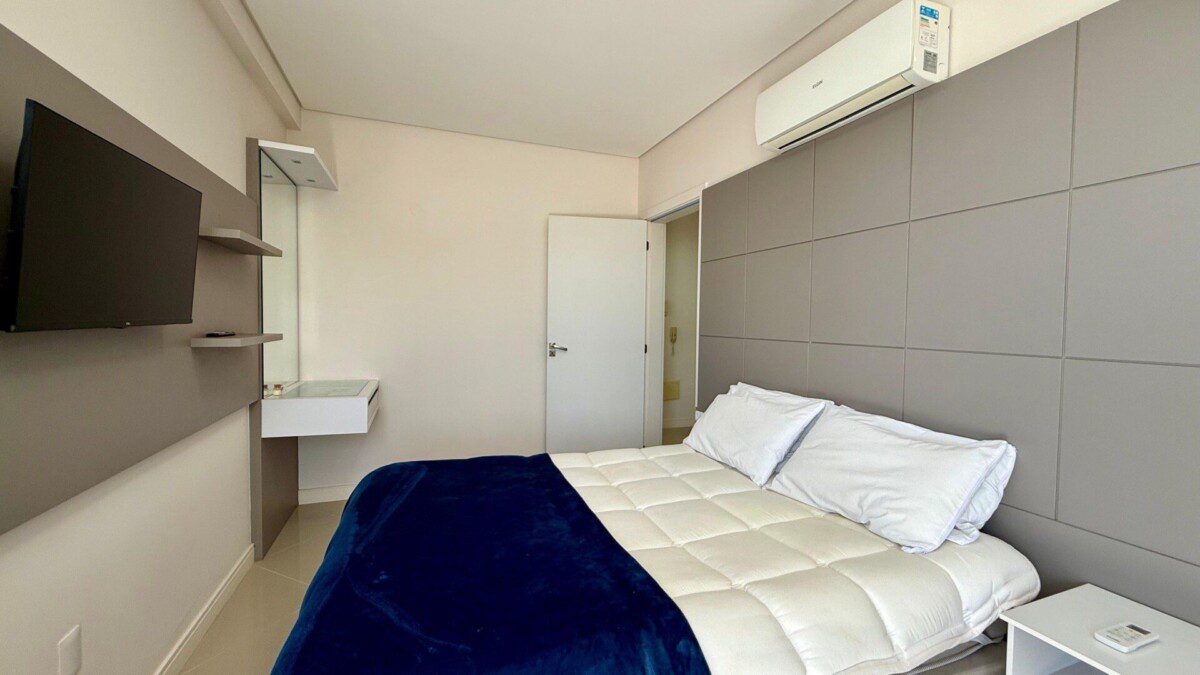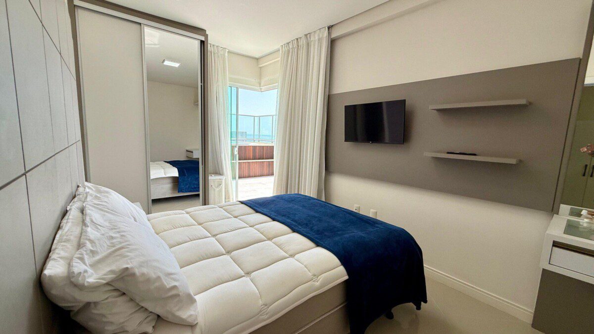 - Suíte Master com cama queen, ar-condicionado, SMART TV, roupeiro e acesso à sacada com vista para o mar.