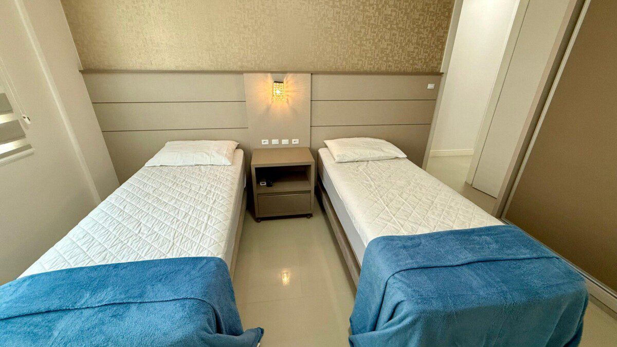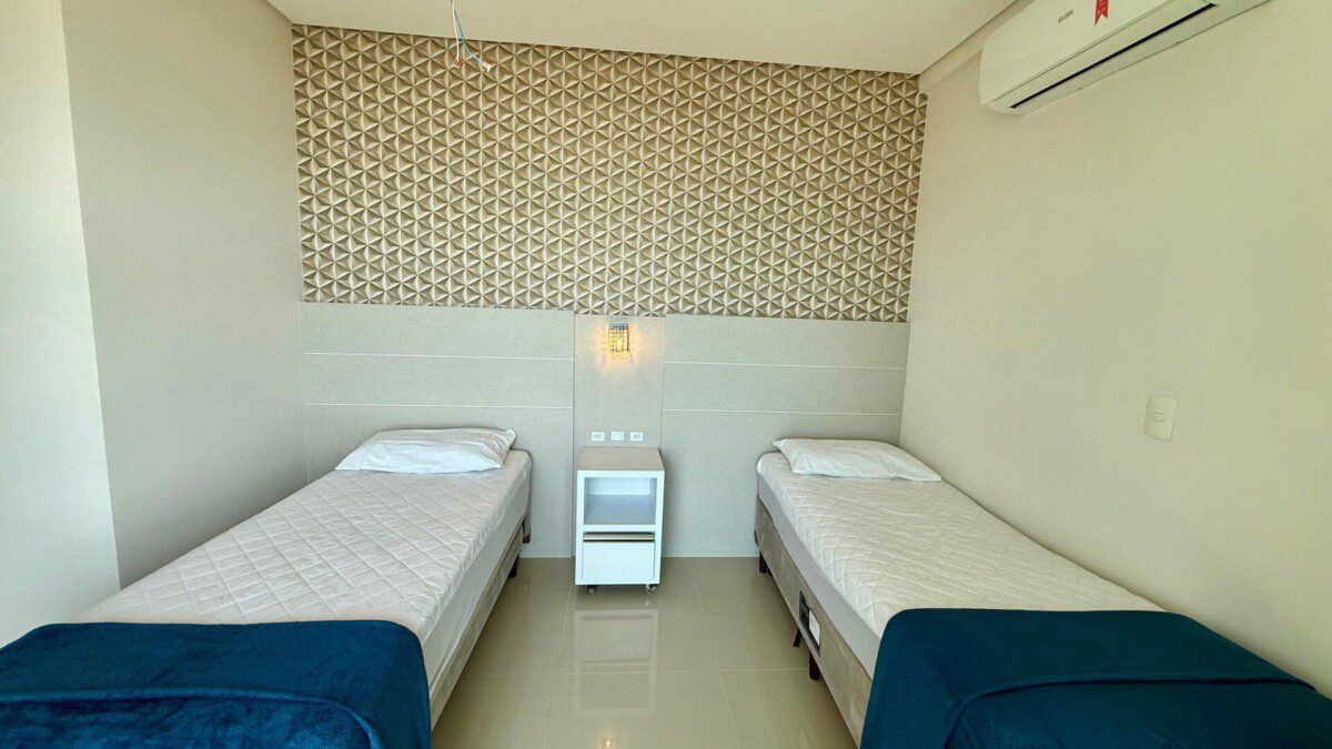 - Suíte com duas camas box de solteiro (com opção de unir formando cama queen), cama auxiliar, ar-condicionado e vista para o mar.