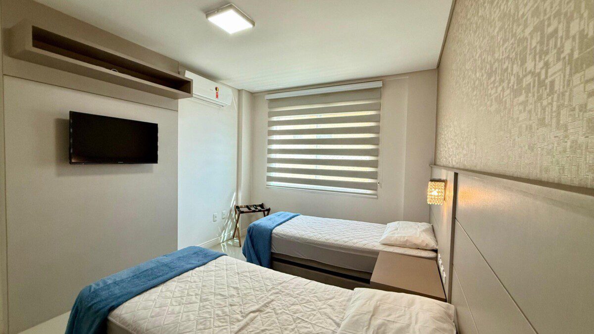 - Dormitório com duas camas box de solteiro (convertíveis em cama queen) e duas camas auxiliares de solteiro, ar-condicionado e SmartTV